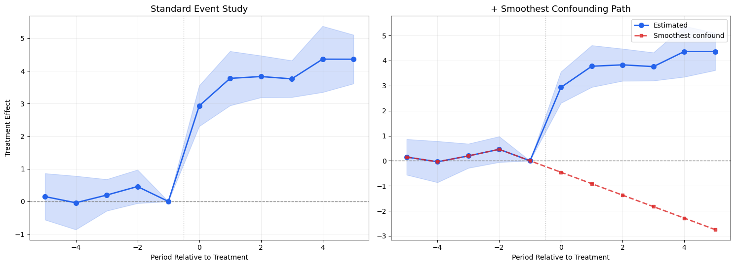 fig, axes = plt.subplots(1, 2, figsize=(15, 5.5))# Left: standard event studyax = axes[0]ax.fill_between(periods_demo, est_demo -1.96*se_demo, est_demo +1.96*se_demo, alpha=0.2, color='#2563eb')ax.plot(periods_demo, est_demo, 'o-', color='#2563eb', markersize=7, linewidth=2, zorder=3)ax.axhline(0, color='gray', linestyle='--', linewidth=1)ax.axvline(-0.5, color='gray', linestyle=':', linewidth=1, alpha=0.5)ax.set_title('Standard Event Study', fontsize=13)ax.set_xlabel('Period Relative to Treatment')ax.set_ylabel('Treatment Effect')ax.grid(True, alpha=0.2)# Right: with smoothest confounding pathax = axes[1]ax.fill_between(periods_demo, est_demo -1.96*se_demo, est_demo +1.96*se_demo, alpha=0.2, color='#2563eb')ax.plot(periods_demo, est_demo, 'o-', color='#2563eb', markersize=7, linewidth=2, zorder=3, label='Estimated')ax.plot(smooth_periods, smooth_path, 's--', color='#dc2626', markersize=5, linewidth=2, alpha=0.8, label='Smoothest confound', zorder=4)ax.axhline(0, color='gray', linestyle='--', linewidth=1)ax.axvline(-0.5, color='gray', linestyle=':', linewidth=1, alpha=0.5)ax.set_title('+ Smoothest Confounding Path', fontsize=13)ax.set_xlabel('Period Relative to Treatment')ax.legend(fontsize=10)ax.grid(True, alpha=0.2)plt.tight_layout()plt.show()print('\nInterpretation: The red dashed line shows the smoothest trend violation')print('consistent with pre-treatment data, extrapolated post-treatment.')print('This represents the potential bias under the least curvature assumption.')