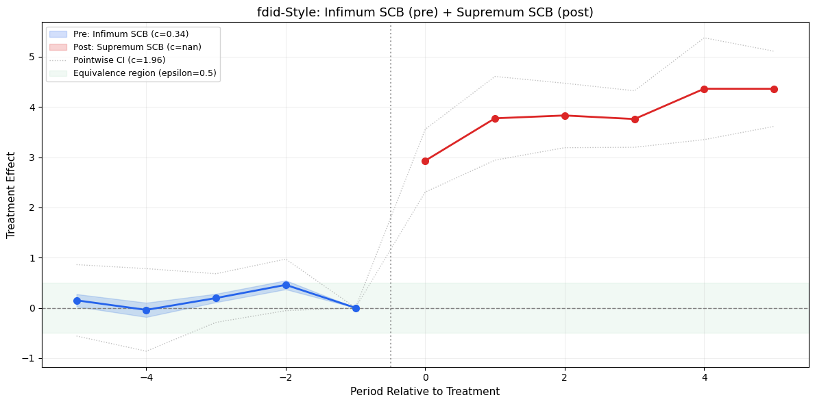 Infimum-based SCBs (pre-treatment): For equivalence testing — if the entire band lies within \([-\epsilon, +\epsilon]\), we have evidence for parallel trends (not just failure to reject)
