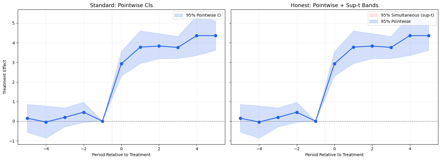 # Visual comparison: pointwise vs sup-t bandsfig, axes = plt.subplots(1, 2, figsize=(15, 5.5), sharey=True)periods_demo = es_df['period'].valuesest_demo = es_df['estimate'].valuesse_demo = es_df['se'].values# Build a realistic vcov for our synthetic dataK_demo =len(periods_demo)# Use a simple AR(1) correlation structurerho =0.5corr = np.array([[rho**abs(i-j) for j inrange(K_demo)] for i inrange(K_demo)])vcov_demo = np.outer(se_demo, se_demo) * corrc_supt_demo = compute_supt_critical_value(vcov_demo, alpha=0.05)# Left: pointwise CIsax = axes[0]ci_low_pw = est_demo -1.96* se_democi_high_pw = est_demo +1.96* se_demoax.fill_between(periods_demo, ci_low_pw, ci_high_pw, alpha=0.2, color='#2563eb', label='95% Pointwise CI')ax.plot(periods_demo, est_demo, 'o-', color='#2563eb', markersize=7, linewidth=2, zorder=3)ax.axhline(0, color='gray', linestyle='--', linewidth=1)ax.axvline(-0.5, color='gray', linestyle=':', linewidth=1, alpha=0.5)ax.set_title('Standard: Pointwise CIs', fontsize=13)ax.set_xlabel('Period Relative to Treatment')ax.set_ylabel('Treatment Effect')ax.legend(fontsize=10)ax.grid(True, alpha=0.2)# Right: sup-t bandsax = axes[1]ci_low_supt = est_demo - c_supt_demo * se_democi_high_supt = est_demo + c_supt_demo * se_demo# Show pointwise as inner bandax.fill_between(periods_demo, ci_low_supt, ci_high_supt, alpha=0.12, color='#dc2626', label='95% Simultaneous (sup-t)')ax.fill_between(periods_demo, ci_low_pw, ci_high_pw, alpha=0.2, color='#2563eb', label='95% Pointwise')ax.plot(periods_demo, est_demo, 'o-', color='#2563eb', markersize=7, linewidth=2, zorder=3)ax.axhline(0, color='gray', linestyle='--', linewidth=1)ax.axvline(-0.5, color='gray', linestyle=':', linewidth=1, alpha=0.5)ax.set_title('Honest: Pointwise + Sup-t Bands', fontsize=13)ax.set_xlabel('Period Relative to Treatment')ax.legend(fontsize=10)ax.grid(True, alpha=0.2)plt.tight_layout()plt.show()print(f'\nSup-t bands are {c_supt_demo/1.96:.1f}x wider than pointwise CIs')print('This accounts for multiple testing across all periods simultaneously')