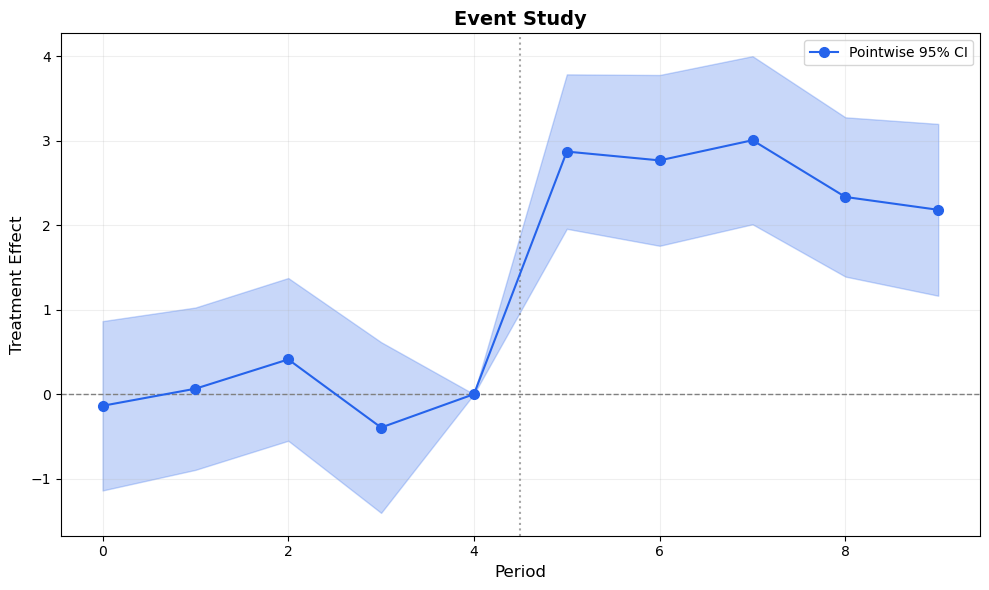 # Build full plot arrays (including reference period)periods_plot =sorted(all_periods + [ref_period])est_plot = np.array([0.0if p == ref_period else results.period_effects[p].effect for p in periods_plot])se_plot = np.array([0.0if p == ref_period else results.period_effects[p].se for p in periods_plot])periods_plot = np.array(periods_plot)z = scipy_stats.norm.ppf(0.975)fig, ax = plt.subplots(figsize=(10, 6))ax.fill_between(periods_plot, est_plot - z * se_plot, est_plot + z * se_plot, alpha=0.25, color='#2563eb')ax.plot(periods_plot, est_plot, 'o-', color='#2563eb', markersize=7, linewidth=1.5, zorder=3, label='Pointwise 95% CI')ax.axhline(0, color='gray', linestyle='--', linewidth=1)ax.axvline(ref_period +0.5, color='gray', linestyle=':', linewidth=1.5, alpha=0.7)ax.set_xlabel('Period', fontsize=12)ax.set_ylabel('Treatment Effect', fontsize=12)ax.set_title('Event Study', fontsize=14, fontweight='bold')ax.legend(fontsize=10)ax.grid(True, alpha=0.2)plt.tight_layout()plt.show()