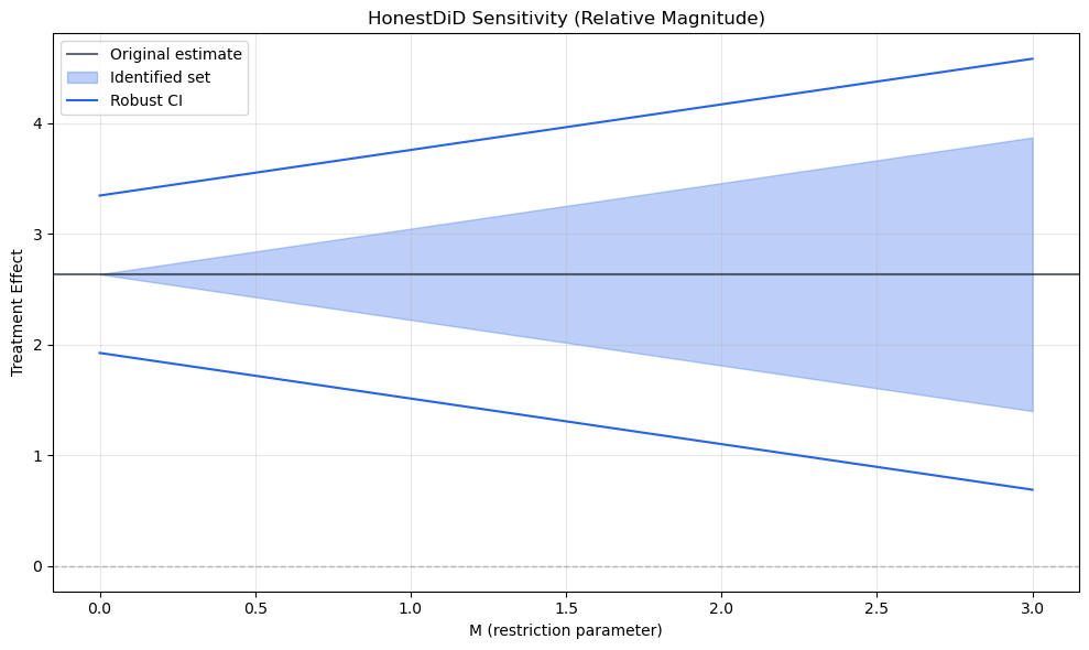 # HonestDiD: Relative Magnitudehonest_rm = HonestDiD(method='relative_magnitude', M=1.0)rm_results = honest_rm.fit(results)print('=== Relative Magnitude (M=1.0) ===')print(rm_results.summary())print()# Breakdown valuebreakdown = honest_rm.breakdown_value(results)print(f'Breakdown value: M = {breakdown:.2f}')print(f' (Result holds as long as post-treatment violations')print(f' are less than {breakdown:.1f}x the worst pre-treatment violation)')