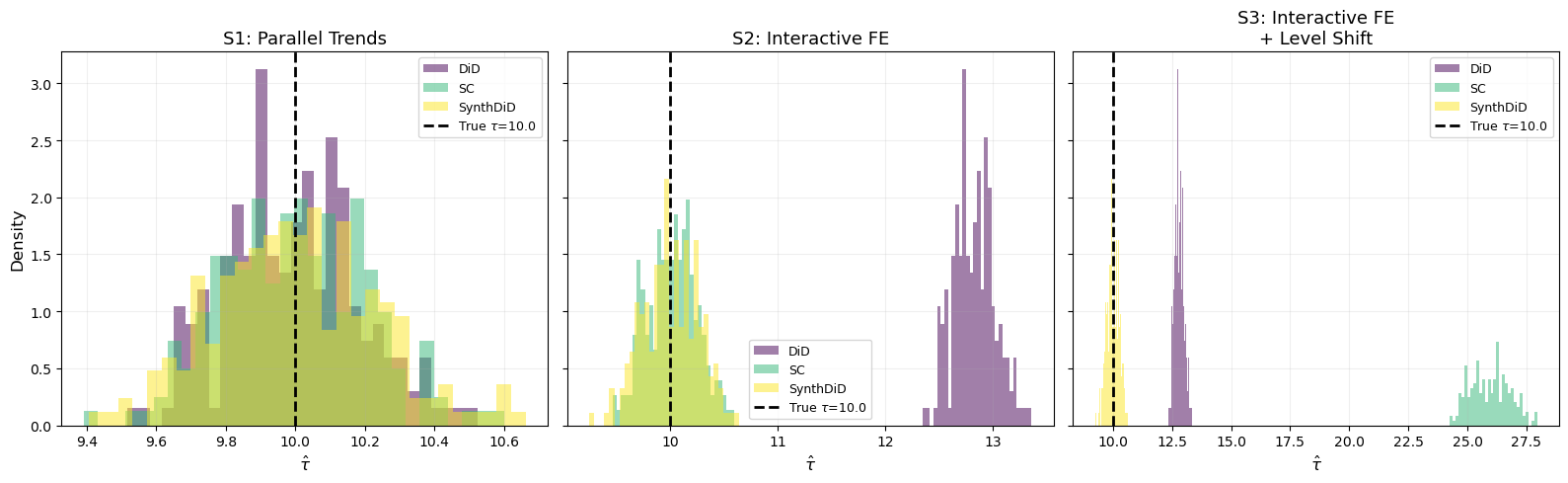 n_mc =200tau_true =10.0# Pre-draw fixed control loadings (same across MC runs, only noise varies)rng_mc = np.random.default_rng(0)gamma_co_mc = rng_mc.uniform(0, 3, 30)scenarios = {'S1: Parallel Trends': {'alpha_tr': 3.0, 'gamma_co': np.zeros(30), 'gamma_tr': 0.0, },'S2: Interactive FE': {'alpha_tr': 3.0, 'gamma_co': gamma_co_mc, 'gamma_tr': 2.5, },'S3: Interactive FE\n+ Level Shift': {'alpha_tr': 20.0, 'gamma_co': gamma_co_mc, 'gamma_tr': 2.5, },}mc_results = {s: {m: [] for m in ['DiD', 'SC', 'SynthDiD']} for s in scenarios}for s_name, s_params in scenarios.items():print(f"Running MC for {s_name}...", end=" ")for i inrange(n_mc): df_mc, info_mc = generate_panel( N_co=30, T_pre=20, T_post=10, tau=tau_true, alpha_tr=s_params['alpha_tr'], gamma_co=s_params['gamma_co'], gamma_tr=s_params['gamma_tr'], sigma=0.5, seed=1000+ i, ) Y_mc = info_mc['Y'] N_co_mc = info_mc['N_co'] T_pre_mc = info_mc['T_pre']# DiD tau_did, _ = estimate_did_manual(Y_mc, N_co_mc, T_pre_mc) mc_results[s_name]['DiD'].append(tau_did)# SC tau_sc, _, _ = estimate_sc_manual(Y_mc, N_co_mc, T_pre_mc) mc_results[s_name]['SC'].append(tau_sc)# SynthDiD post_periods =list(range(T_pre_mc, T_pre_mc + info_mc['T_post']))try: sdid = SyntheticDiD(seed=i) sdid_res = sdid.fit( df_mc, outcome='y', treatment='treated', unit='unit', time='period', post_periods=post_periods, ) mc_results[s_name]['SynthDiD'].append(sdid_res.att)exceptException: mc_results[s_name]['SynthDiD'].append(np.nan)print("done.")print("\nMonte Carlo complete.")