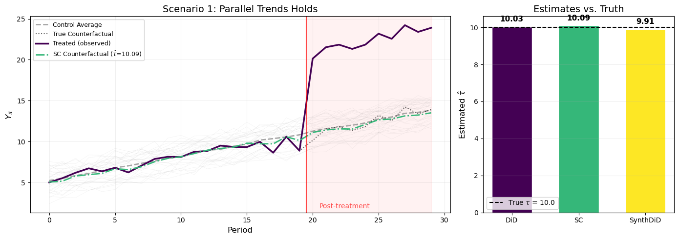 # Scenario 1: Parallel trends (gamma = 0 for all units)df1, info1 = generate_panel( N_co=30, T_pre=20, T_post=10, tau=10.0, alpha_tr=3.0, # within the control range [1, 5] gamma_co=None, # defaults to zeros gamma_tr=0.0, # no interactive FE sigma=0.5, seed=42,)results1 = estimate_all(df1, info1)print("="*50)print("Scenario 1: Parallel Trends Holds")print("="*50)print(f"True tau: {info1['tau']:.2f}")print(f"DiD: {results1['DiD']['tau']:.2f}")print(f"SC: {results1['SC']['tau']:.2f}")print(f"SynthDiD: {results1['SynthDiD']['tau']:.2f} (SE: {results1['SynthDiD']['se']:.2f})")