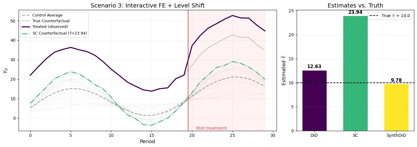 # Scenario 3: Interactive FE + level shiftrng3 = np.random.default_rng(42)gamma_co_3 = rng3.uniform(0, 3, 30)df3, info3 = generate_panel( N_co=30, T_pre=20, T_post=10, tau=10.0, alpha_tr=20.0, # FAR outside control range [1, 5] gamma_co=gamma_co_3, # heterogeneous factor loadings gamma_tr=2.5, # within control range sigma=0.5, seed=42,)results3 = estimate_all(df3, info3)print("="*50)print("Scenario 3: Interactive FE + Level Shift")print("="*50)print(f"True tau: {info3['tau']:.2f}")print(f"DiD: {results3['DiD']['tau']:.2f} (bias: {results3['DiD']['tau'] - info3['tau']:+.2f})")print(f"SC: {results3['SC']['tau']:.2f} (bias: {results3['SC']['tau'] - info3['tau']:+.2f})")print(f"SynthDiD: {results3['SynthDiD']['tau']:.2f} (bias: {results3['SynthDiD']['tau'] - info3['tau']:+.2f})")